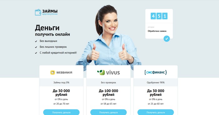 Сайт для тех, кто работает с партнерскими программами МФО и банков. Сайт имеет привлекательный внешний вид, а также на нем удобно размещать свои реферальные ссылки